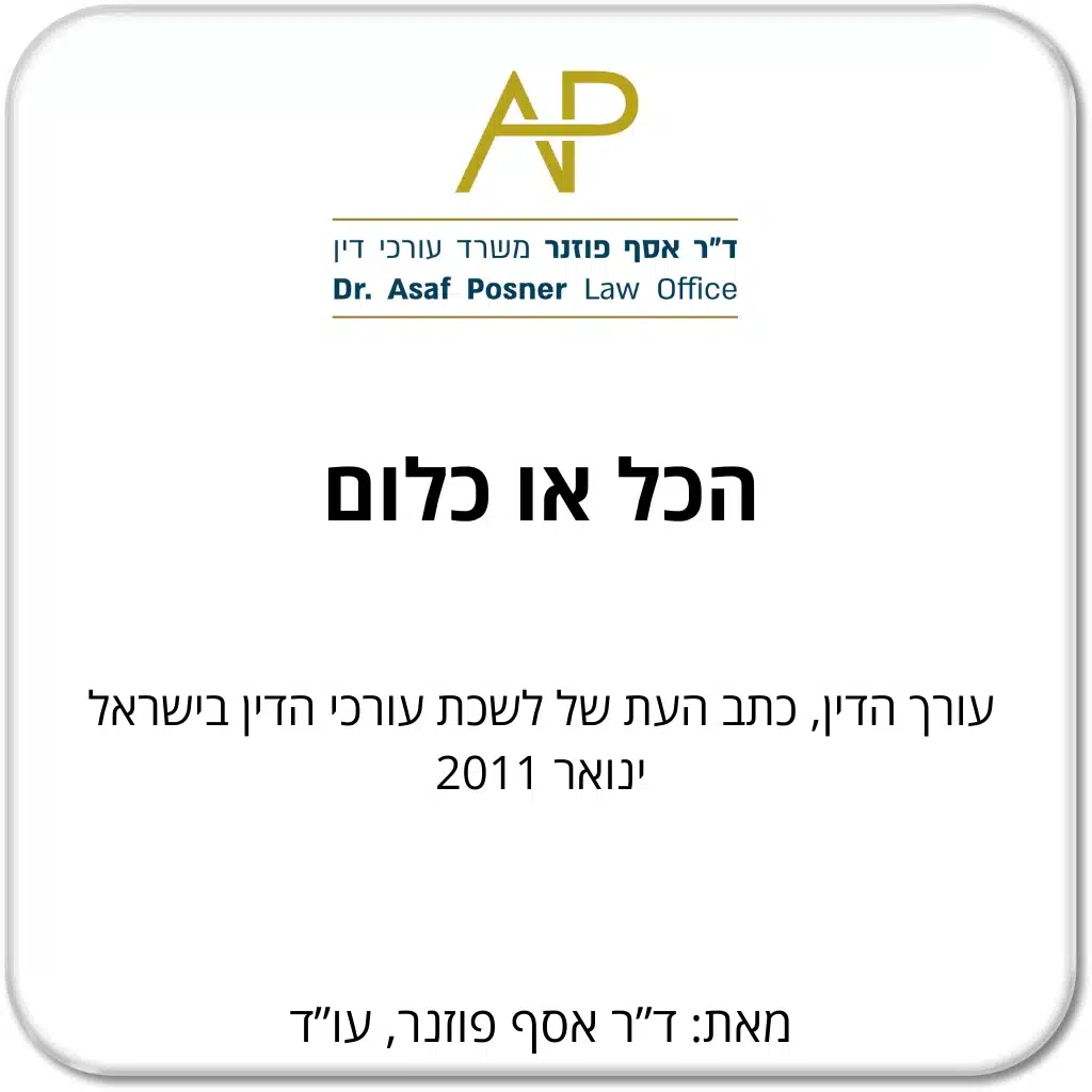 הכל או כלום ד"ר אסף פוזנר פורסם בעורך הדין, כתב העת של לשכת עורכי הדין בישראל, ינואר 2011 Powered By EmbedPress אולי יעניין אותך…